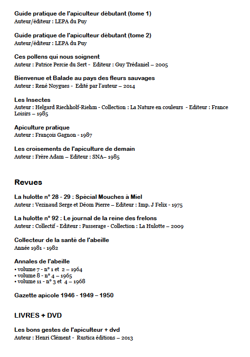 - N'hésitez pas à nous communiquer les références d'ouvrages qu'il vous semblerait intéressant d'acquérir afin de compléter ce fond de documentation apicole.